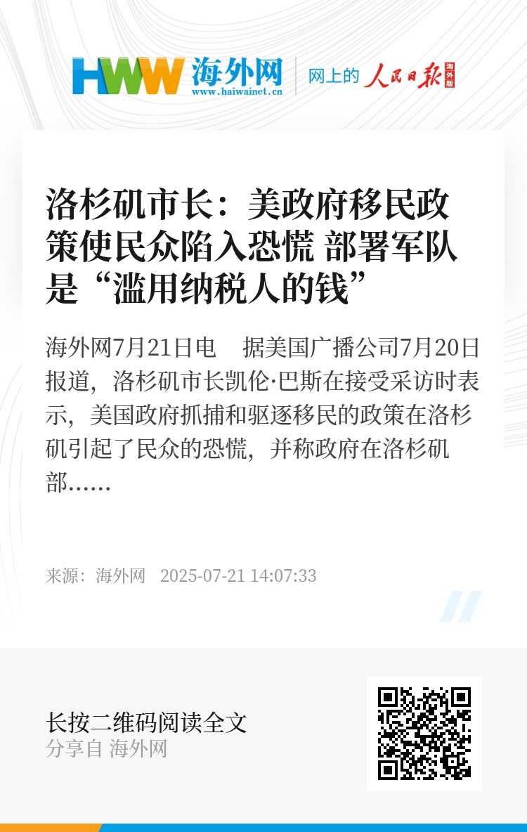 海外网7月21日电 据美国广播公司7月20日报道,洛杉矶市长凯伦·巴斯在接受采访时表示,美国政府抓捕和驱逐移民的政策在洛杉矶引起了民众的恐慌,并称政府在洛杉矶部署军队的行为是“滥用纳税人的钱”。