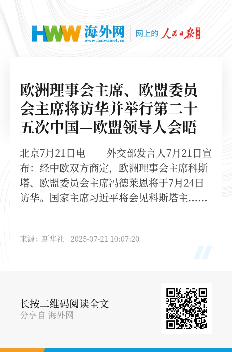 新华社北京7月21日电 外交部发言人7月21日宣布:经中欧双方商定,欧洲理事会主席科斯塔、欧盟委员会主席冯德莱恩将于7月24日访华。国家主席习近平将会见科斯塔主席和冯德莱恩主席,国务院总理李强将同欧盟两主席共同主持第二十五次中国—欧盟领导人会晤。