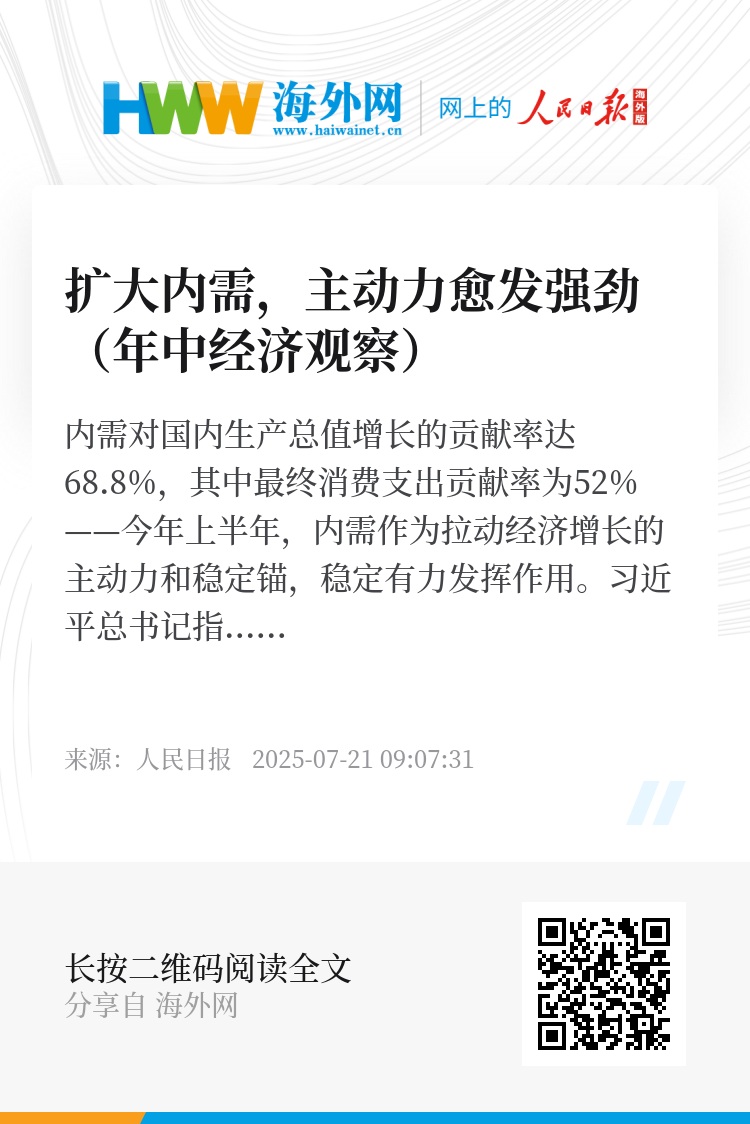 内需对国内生产总值增长的贡献率达68.8%,其中最终消费支出贡献率为52%——今年上半年,内需作为拉动经济增长的主动力和稳定锚,稳定有力发挥作用。
