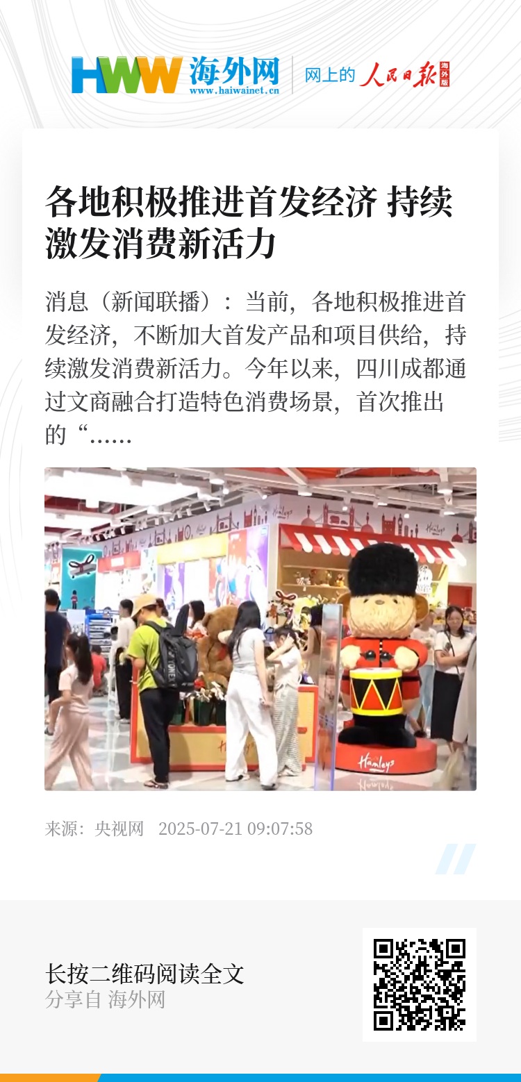 央视网消息(新闻联播):当前,各地积极推进首发经济,不断加大首发产品和项目供给,持续激发消费新活力。