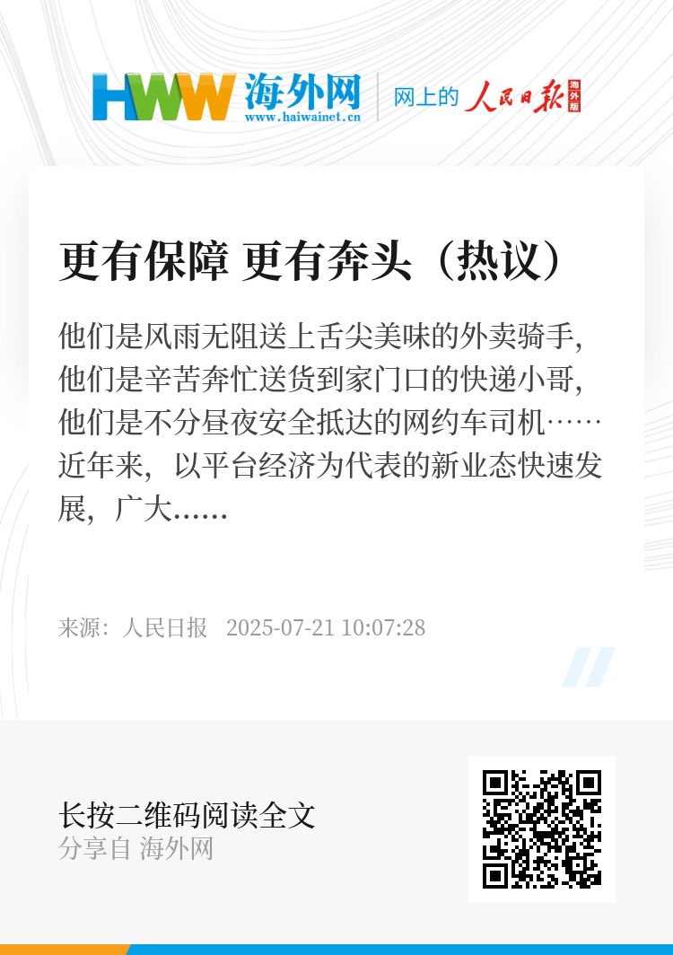 机制保障人、举措服务人、感情激励人、事业成就人……新就业群体已经成为经济社会发展不可或缺的重要力量,希望社会各界一起努力,共创共享更加美好的生活。(林丽鹂)