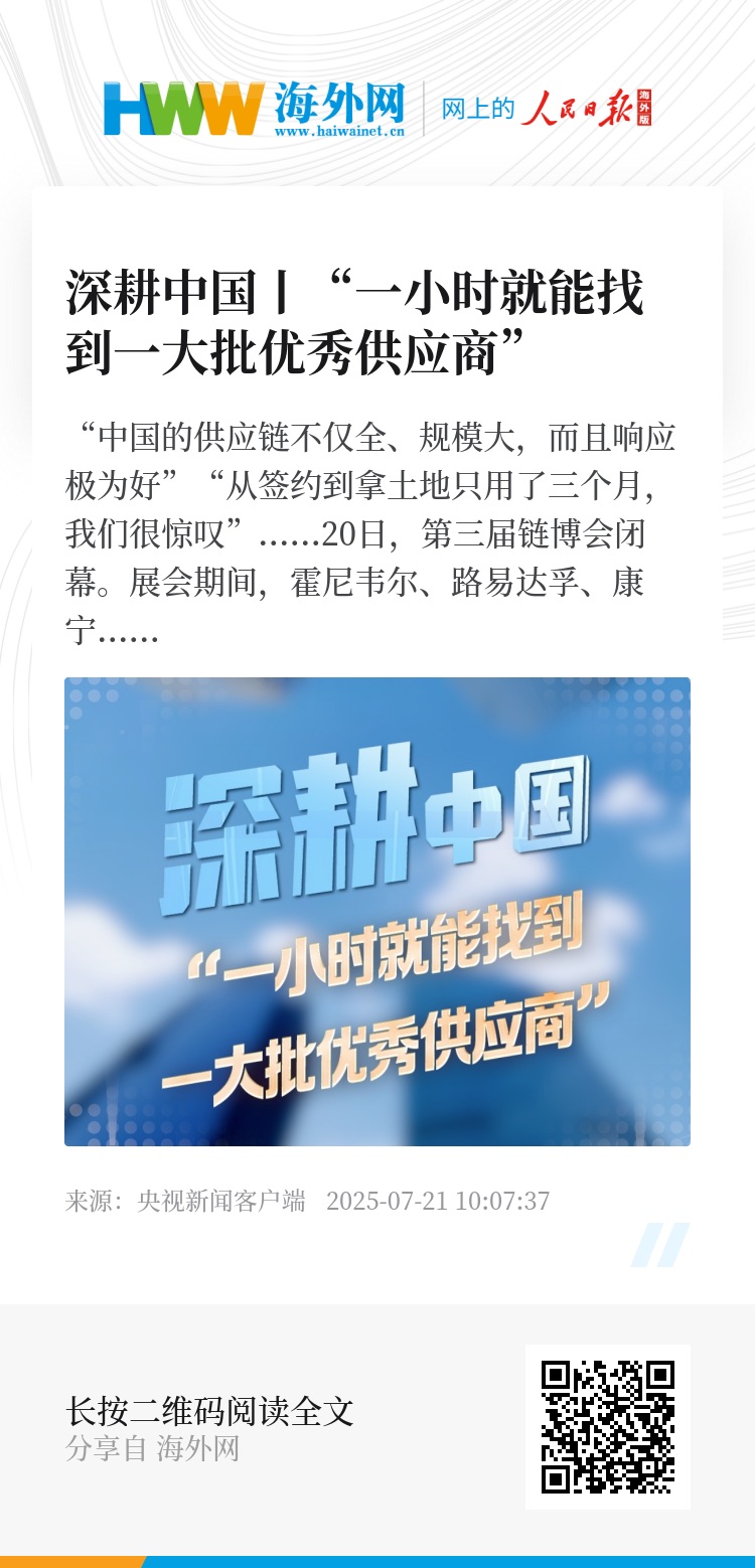 “中国的供应链不仅全、规模大,而且响应极为好”“从签约到拿土地只用了三个月,我们很惊叹”......20日,第三届链博会闭幕。展会期间,霍尼韦尔、路易达孚、康宁、瓦克化学等多家外资在接受央视新闻采访时不约而同地点赞中国强大的供应链,并表示将继续深耕中国、与中国乃至全球供应商一道共塑产业链。