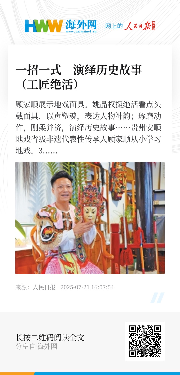 这些年,随着贵州多种特色文化活动走红出圈,安顺地戏也拥有了更好的文化传承氛围。“只要有人愿意看,有人愿意学,地戏就不会消失。”顾家顺说。(记者 陈隽逸)