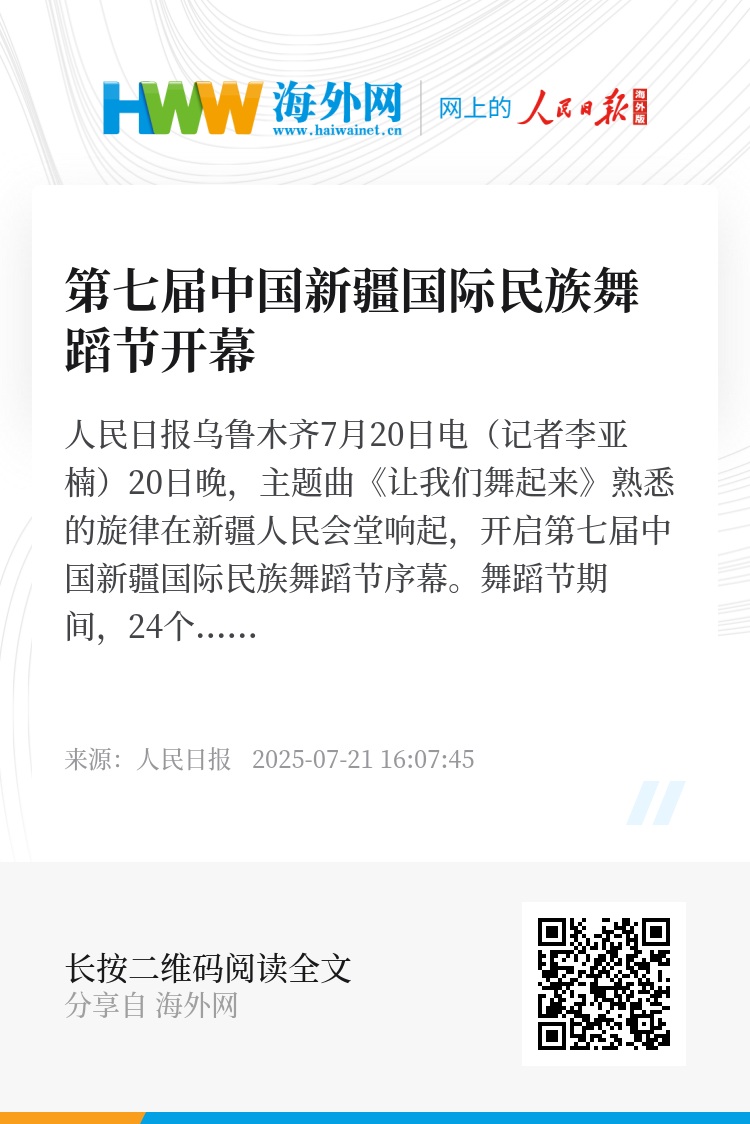 人民日报乌鲁木齐7月20日电(记者李亚楠)20日晚,主题曲《让我们舞起来》熟悉的旋律在新疆人民会堂响起,开启第七届中国新疆国际民族舞蹈节序幕。舞蹈节期间,24个中外艺术团队将为新疆各族观众带来52场演出。