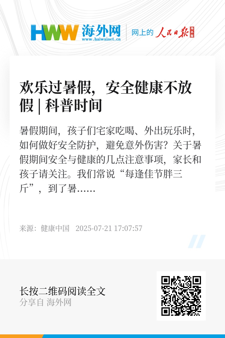 暑假期间,孩子们宅家吃喝、外出玩乐时,如何做好安全防护,避免意外伤害?关于暑假期间安全与健康的几点注意事项,家长和孩子请关注。
