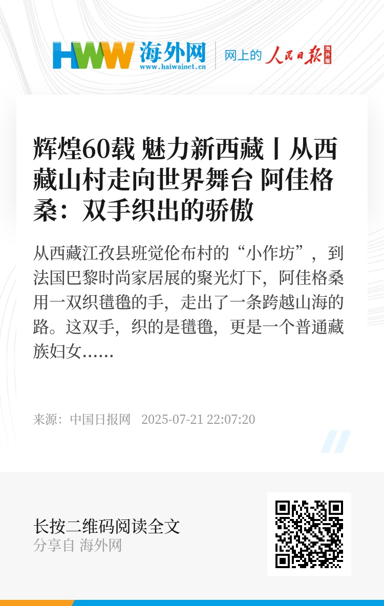 从西藏江孜县班觉伦布村的“小作坊”,到法国巴黎时尚家居展的聚光灯下,阿佳格桑用一双织氆氇的手,走出了一条跨越山海的路。这双手,织的是氆氇,更是一个普通藏族妇女从山村走向世界的骄傲。(记者:于涵)
