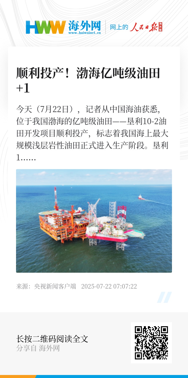 今天(7月22日),记者从中国海油获悉,位于我国渤海的亿吨级油田——垦利10-2油田开发项目顺利投产,标志着我国海上最大规模浅层岩性油田正式进入生产阶段。