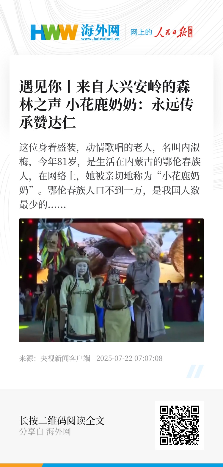 去年,一条《鄂伦春老人吟唱森林之声》的短视频走红,内淑梅干净清澈的歌声打动了很多网友,因为她,不少人知道了鄂伦春,喜欢上了赞达仁。