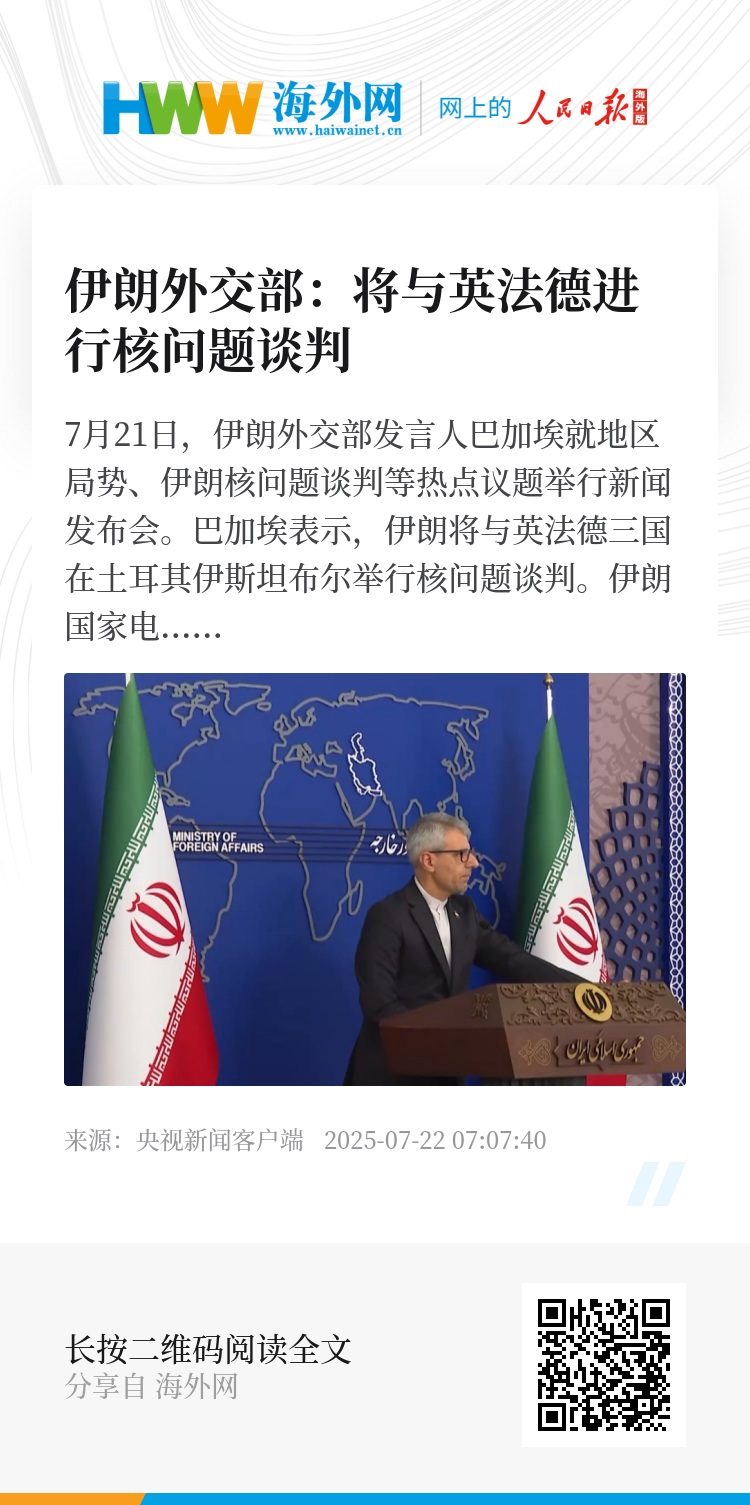 7月21日,伊朗外交部发言人巴加埃就地区局势、伊朗核问题谈判等热点议题举行新闻发布会。巴加埃表示,伊朗将与英法德三国在土耳其伊斯坦布尔举行核问题谈判。