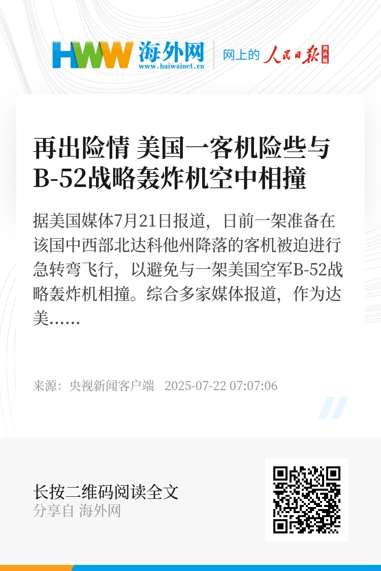 据美国媒体7月21日报道,日前一架准备在该国中西部北达科他州降落的客机被迫进行急转弯飞行,以避免与一架美国空军B-52战略轰炸机相撞。