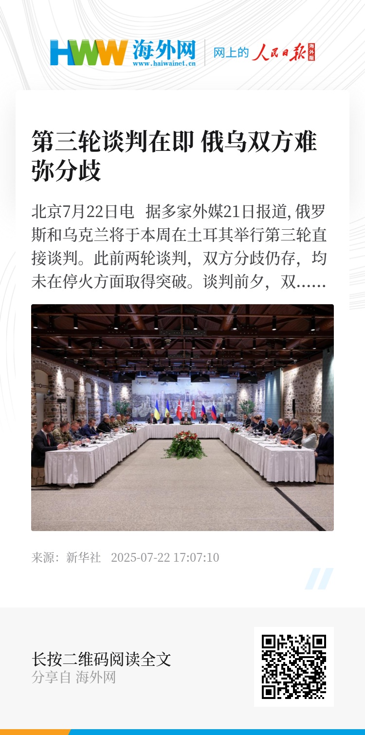 新华社北京7月22日电 据多家外媒21日报道,俄罗斯和乌克兰将于本周在土耳其举行第三轮直接谈判。此前两轮谈判,双方分歧仍存,均未在停火方面取得突破。谈判前夕,双方近来再度互袭,造成人员伤亡,局势未见缓和迹象。
