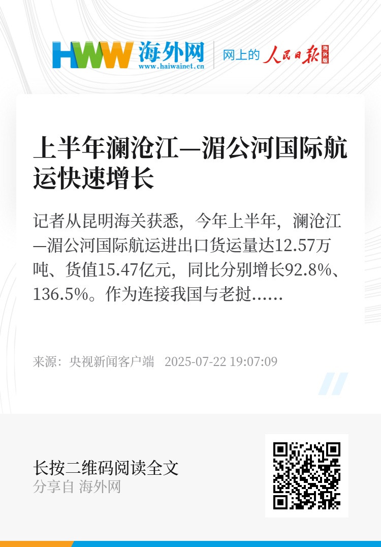 记者从昆明海关获悉,今年上半年,澜沧江—湄公河国际航运进出口货运量达12.57万吨、货值15.47亿元,同比分别增长92.8%、136.5%。作为连接我国与老挝、缅甸、泰国、柬埔寨、越南的“黄金水道”,澜沧江—湄公河国际航运快速发展,有力促进了大湄公河次区域成员国之间的贸易往来和人文交流,为推进“一带一路”注入强劲动力。