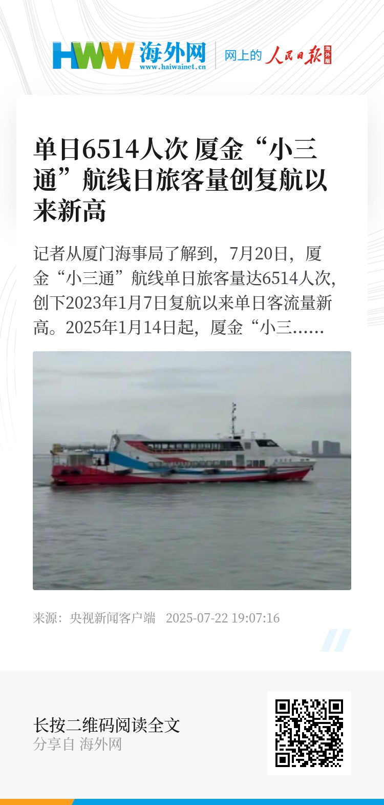 记者从厦门海事局了解到,7月20日,厦金“小三通”航线单日旅客量达6514人次,创下2023年1月7日复航以来单日客流量新高。