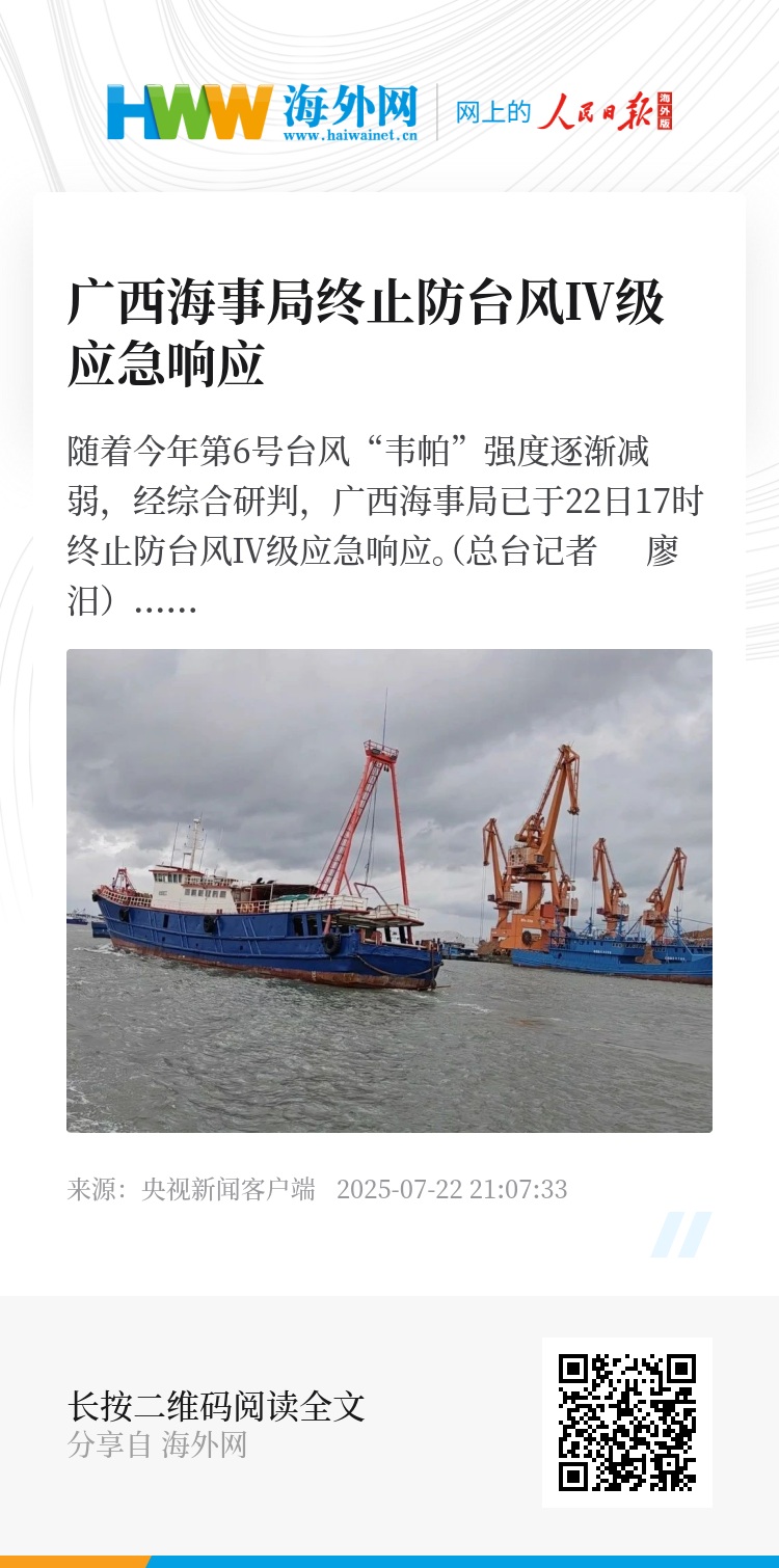 随着今年第6号台风“韦帕”强度逐渐减弱,经综合研判,广西海事局已于22日17时终止防台风Ⅳ级应急响应。
