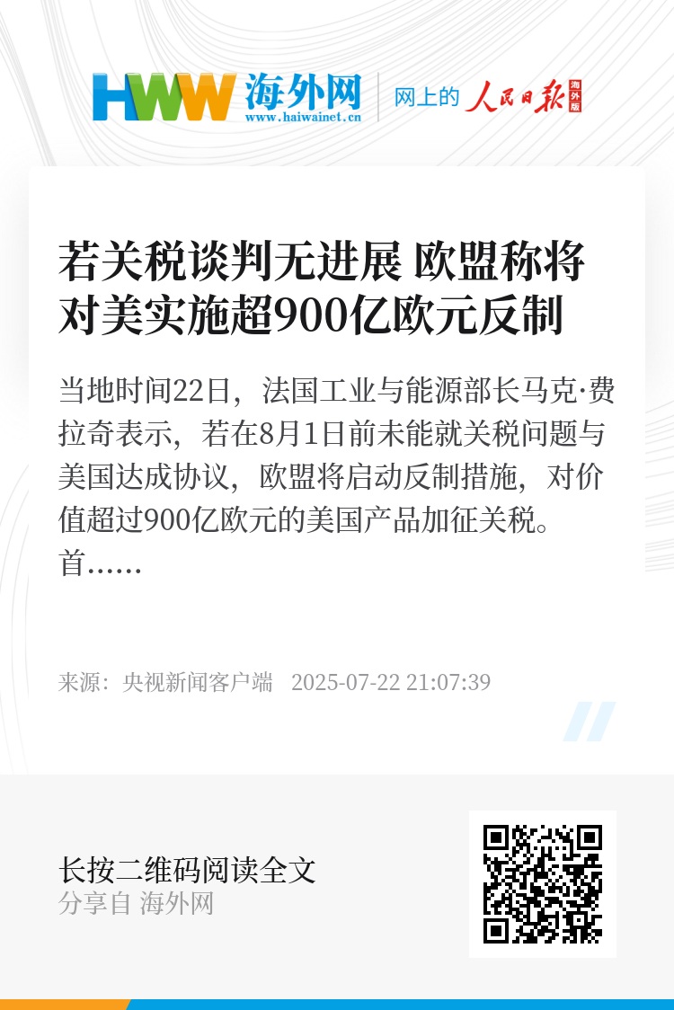 当地时间22日,法国工业与能源部长马克·费拉奇表示,若在8月1日前未能就关税问题与美国达成协议,欧盟将启动反制措施,对价值超过900亿欧元的美国产品加征关税。首轮反制规模为210亿欧元,由欧盟委员会届时立即实施。