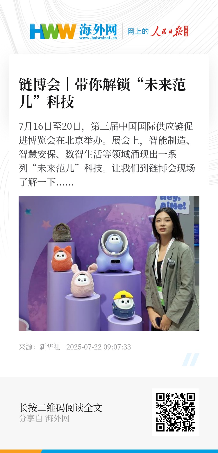 7月16日至20日,第三届中国国际供应链促进博览会在北京举办。展会上,智能制造、智慧安保、数智生活等领域涌现出一系列“未来范儿”科技。让我们到链博会现场了解一下吧!