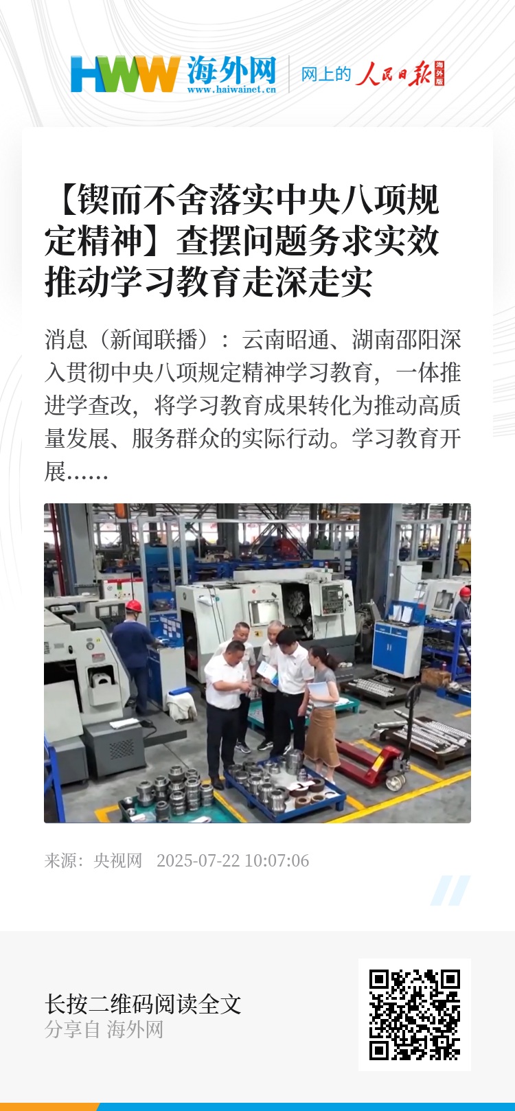 央视网消息(新闻联播):云南昭通、湖南邵阳深入贯彻中央八项规定精神学习教育,一体推进学查改,将学习教育成果转化为推动高质量发展、服务群众的实际行动。