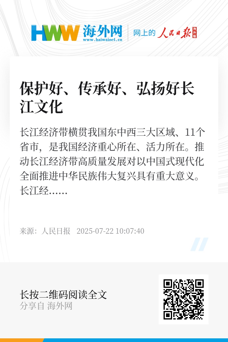 长江是中华民族的母亲河。千百年来,长江流域以水为纽带,连接上下游、左右岸、干支流,形成经济社会大系统,造就了从巴山蜀水到江南水乡的千年文脉,哺育着勤劳勇敢的中华儿女,滋养了源远流长的中华文明,是中华民族的代表性符号和中华文明的标志性象征,是涵养社会主义核心价值观的重要源泉。一部长江文化史,承载着中华民族的共同记忆,灌溉着中华民族共有精神家园。当今世界,文化在经济发展中的作用越来越大,文化与经济相互作用、相互促进,日益成为一个整体。新征程上,把长江文化保护好、传承好、弘扬好,深入发掘长江文化的时代价值,让长江文化绽放时代光芒,是继续推动文化繁荣、建设文化强国的题中应有之义,也将为长江经济带高质量发展提供强大的精神推动力和现实创造力。