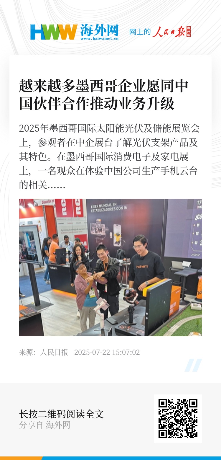 中国和墨西哥企业在可再生能源领域也保持了密切合作。今年3月,2025年墨西哥国际太阳能光伏及储能展览会在该国第二大城市瓜达拉哈拉举行,20多个国家的企业参加了这一被誉为拉美地区最具影响力的可再生能源盛会。参展的中国光伏企业超过40家,向墨西哥乃至拉美市场展示最前沿的光伏组件、储能技术及系统解决方案。