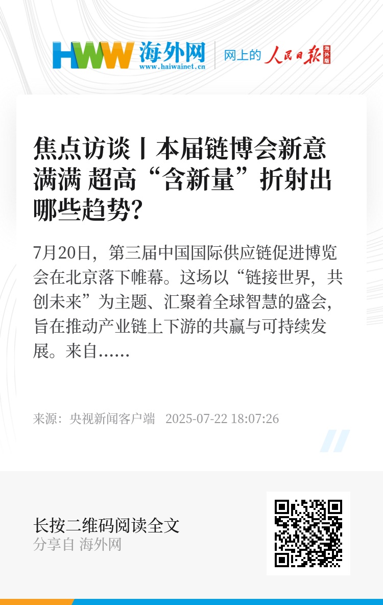 未来,随着超大规模市场的潜力持续释放、高水平开放的持续深化,中国也将以更主动的创新合作,为全球供应链注入韧性与活力,让“链接世界,共创未来”的愿景照进更多现实。