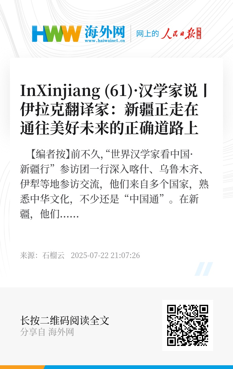 前不久,“世界汉学家看中国·新疆行”参访团一行深入喀什、乌鲁木齐、伊犁等地参访交流,他们来自多个国家,熟悉中华文化,不少还是“中国通”。在新疆,他们看到了什么?有何种感受?近日,《InXinjiang》栏目策划推出《汉学家说》专题系列报道,还原这批汉学家的新疆之行。