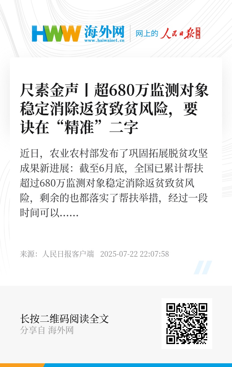近日,农业农村部发布了巩固拓展脱贫攻坚成果新进展:截至6月底,全国已累计帮扶超过680万监测对象稳定消除返贫致贫风险,剩余的也都落实了帮扶举措,经过一段时间可以稳定脱贫——我国牢牢守住了不发生规模性返贫致贫的底线。