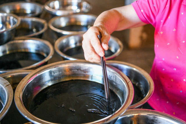 经过冷却后的仙人粄呈黑色凝胶状,食用时用小刀捣碎,配上蜂蜜和香蕉露。南方+ 记者 何森垚 摄