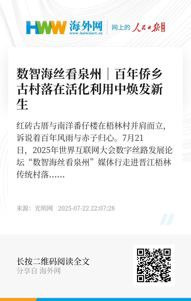 红砖古厝与南洋番仔楼在梧林村并肩而立,诉说着百年风雨与赤子归心。7月21日,2025年世界互联网大会数字丝路发展论坛“数智海丝看泉州”媒体行走进晋江梧林传统村落。