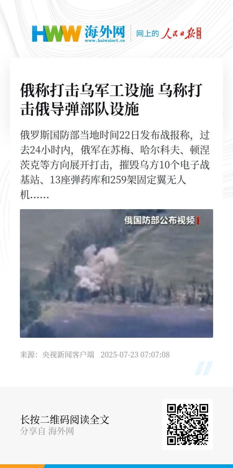 俄罗斯国防部当地时间22日发布战报称,过去24小时内,俄军在苏梅、哈尔科夫、顿涅茨克等方向展开打击,摧毁乌方10个电子战基站、13座弹药库和259架固定翼无人机。俄方对乌无人机组装与储存设施,以及143处乌军部队和外国雇佣兵临时驻扎点实施打击。此外,俄军还使用包括“匕首”高超音速导弹在内的多种武器,对乌克兰多个军工设施实施打击,俄方称所有指定目标均已被摧毁。