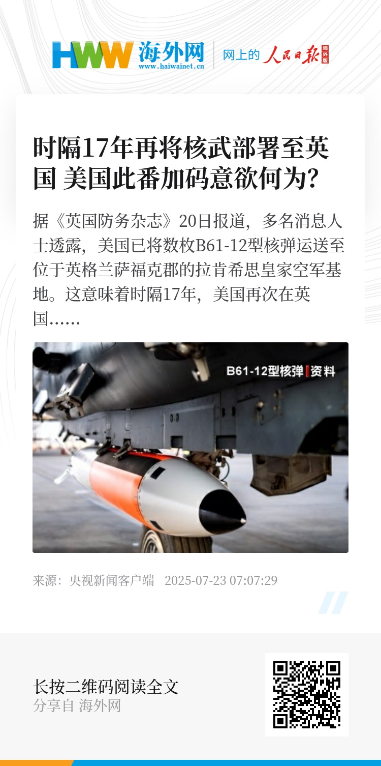 据《英国防务杂志》20日报道,多名消息人士透露,美国已将数枚B61-12型核弹运送至位于英格兰萨福克郡的拉肯希思皇家空军基地。这意味着时隔17年,美国再次在英国部署核武器。