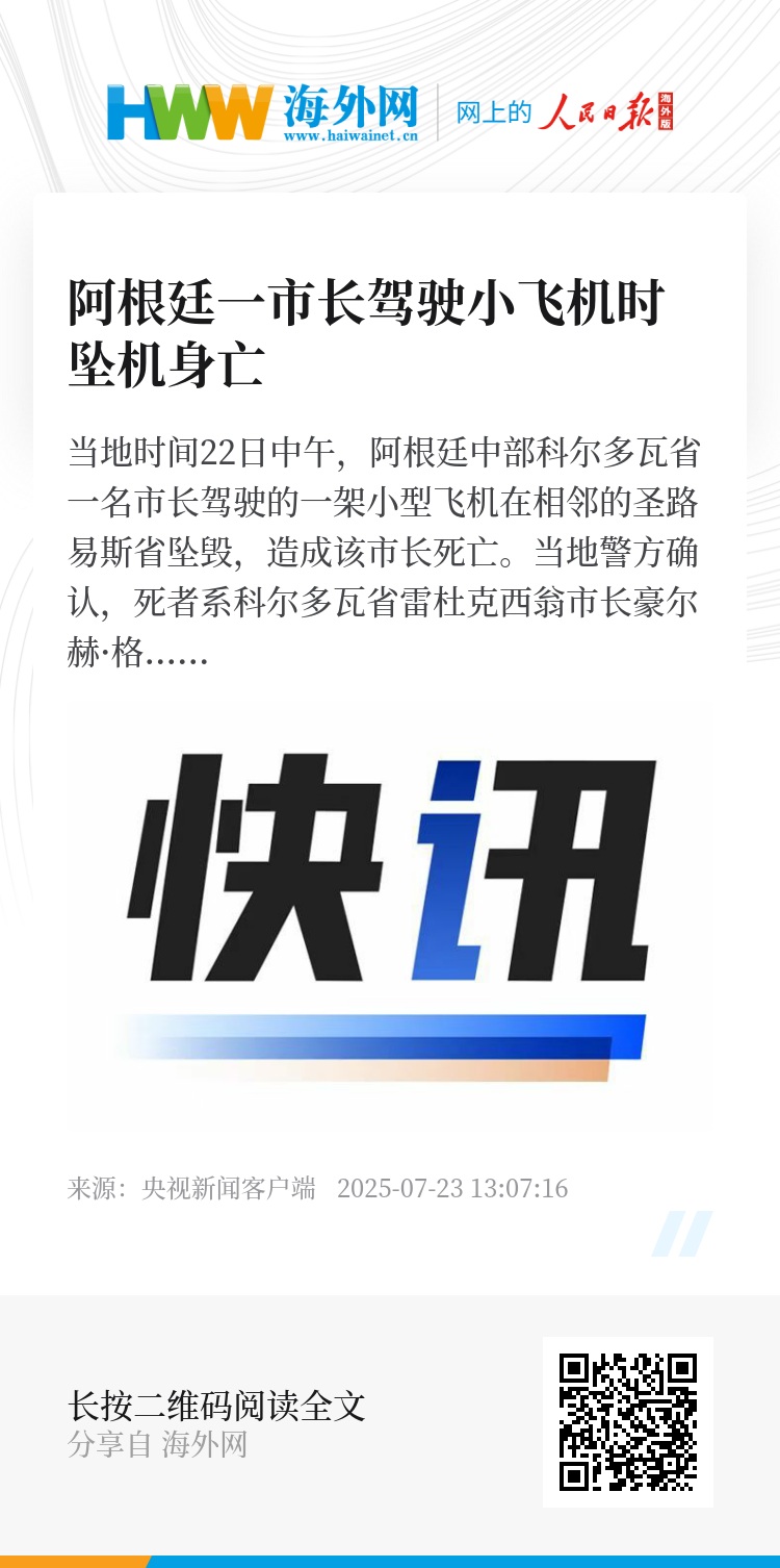 当地时间22日中午,阿根廷中部科尔多瓦省一名市长驾驶的一架小型飞机在相邻的圣路易斯省坠毁,造成该市长死亡。