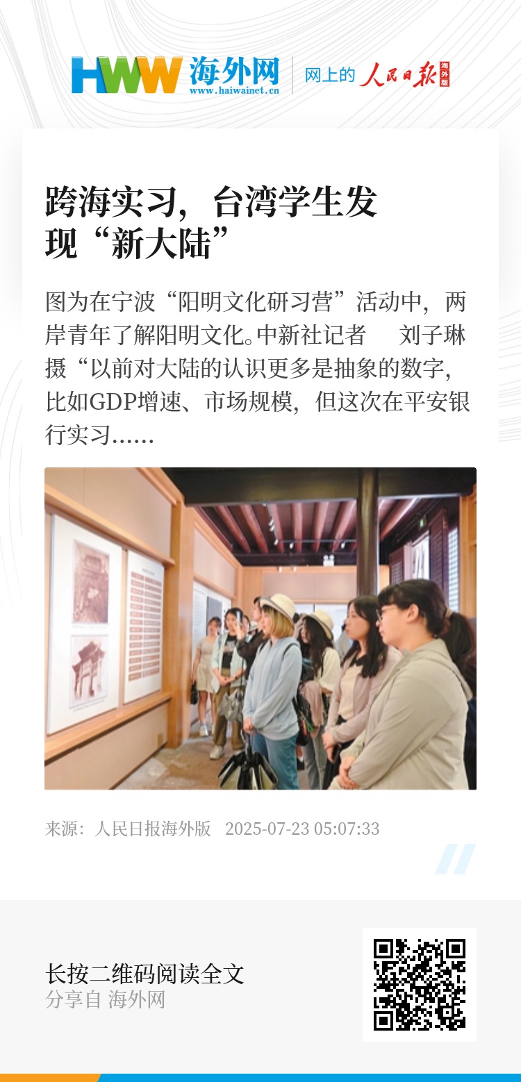 许多大陆城市积极为台生提供暑期实习机会。在日前于四川成都举办的川台青年就业创业发展交流会上,746家在川企业面向台湾青年发布6793个实习就业岗位;2025“WAY!来深圳”台湾青年来深实习就业活动,为台湾青年提供超过1200个实习岗位和1800个就业岗位。