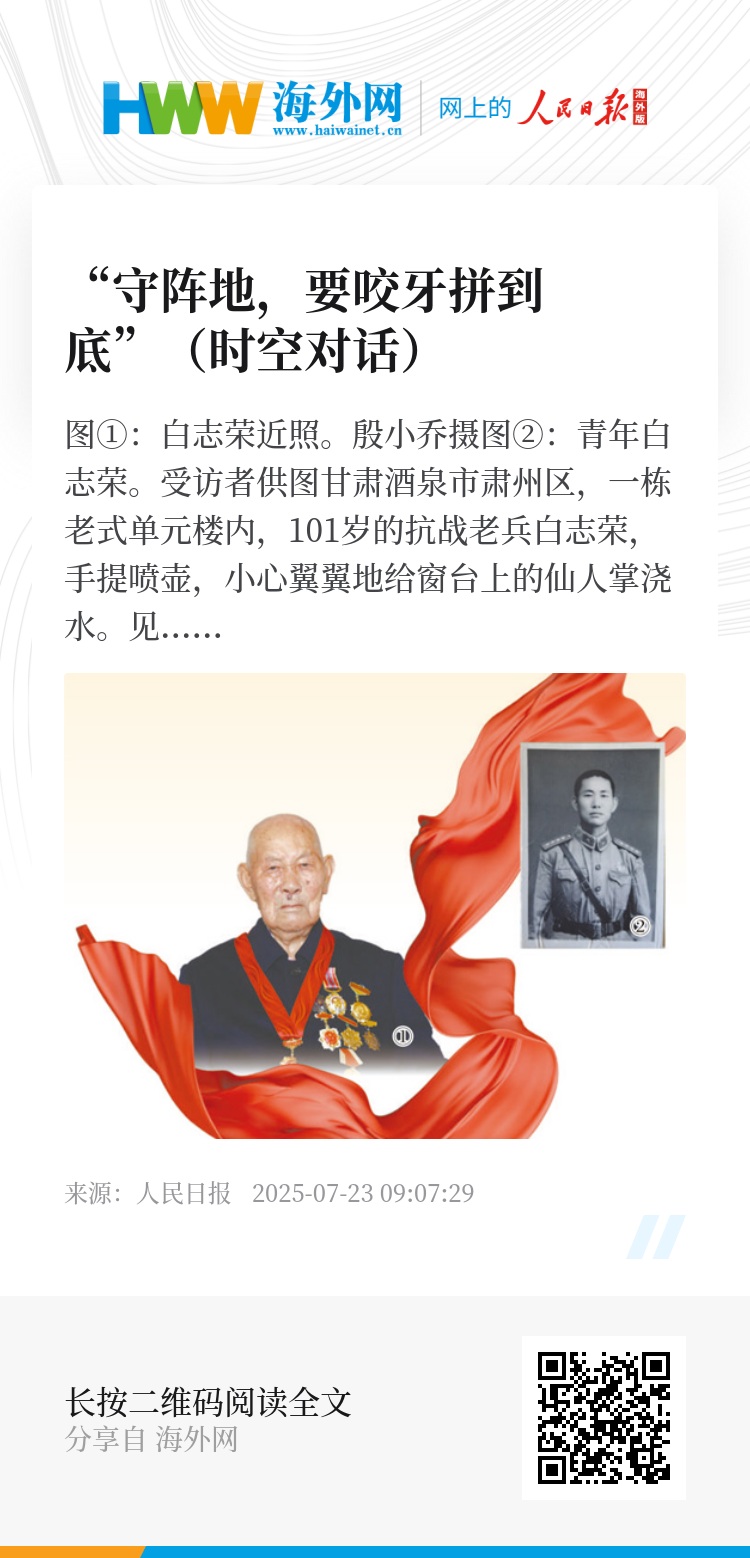 甘肃酒泉市肃州区,一栋老式单元楼内,101岁的抗战老兵白志荣,手提喷壶,小心翼翼地给窗台上的仙人掌浇水。见到记者来访,他热情招手,俯身落座时,头顶露出一块硬币大小的凹陷,那是战争留给他的印记。