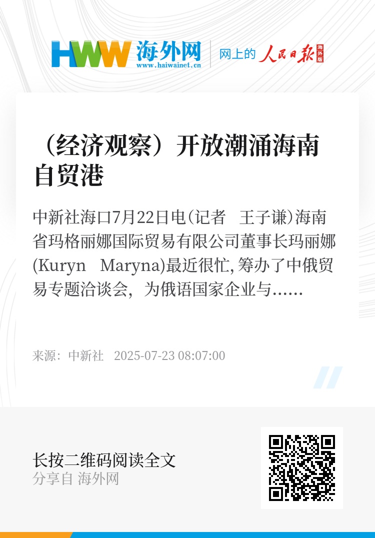 中新社海口7月22日电(记者 王子谦)海南省玛格丽娜国际贸易有限公司董事长玛丽娜(Kuryn Maryna)最近很忙,筹办了中俄贸易专题洽谈会,为俄语国家企业与海南企业合作牵线,“本周还要接待俄罗斯客人,计划投资海南的旅游业和教育行业”。