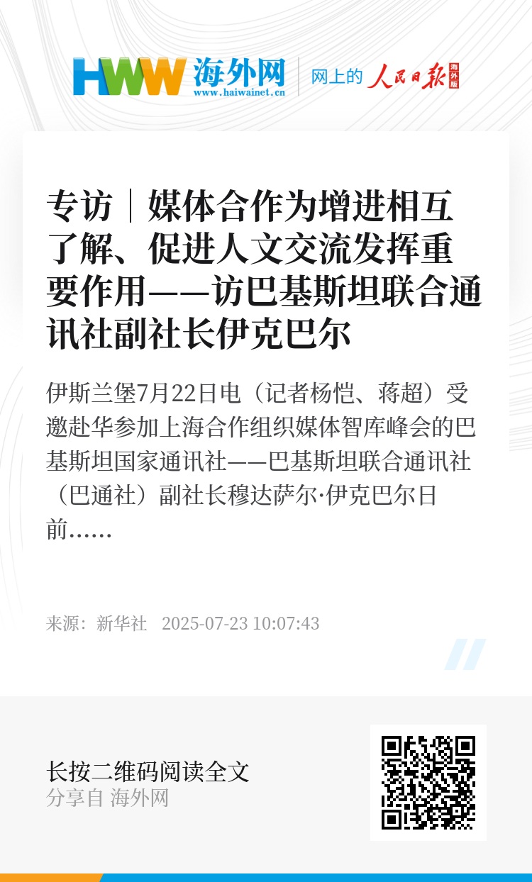 新华社伊斯兰堡7月22日电(记者杨恺、蒋超)受邀赴华参加上海合作组织媒体智库峰会的巴基斯坦国家通讯社——巴基斯坦联合通讯社(巴通社)副社长穆达萨尔·伊克巴尔日前在伊斯兰堡接受新华社记者专访时表示,在“上海精神”指引下,上合组织国家人民日益走亲走近、各领域合作丰富多彩。希望上合组织国家的媒体抓住机遇,以务实行动承担媒体责任,为增进上合组织国家相互了解、促进人文交流发挥重要作用。