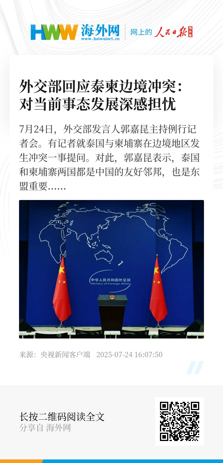 7月24日,外交部发言人郭嘉昆主持例行记者会。有记者就泰国与柬埔寨在边境地区发生冲突一事提问。