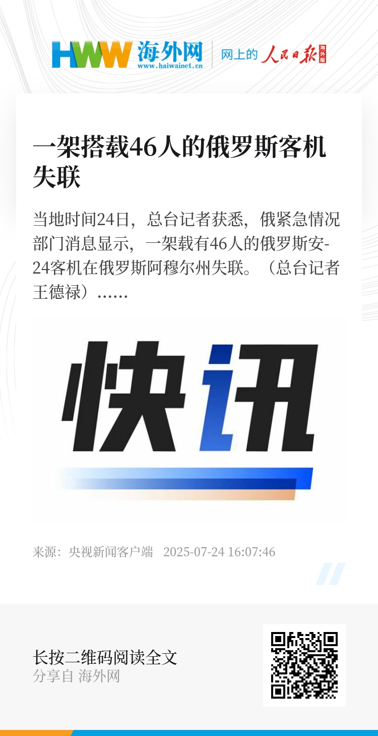 当地时间24日,总台记者获悉,俄紧急情况部门消息显示,一架载有46人的俄罗斯安-24客机在俄罗斯阿穆尔州失联。(总台记者 王德禄)