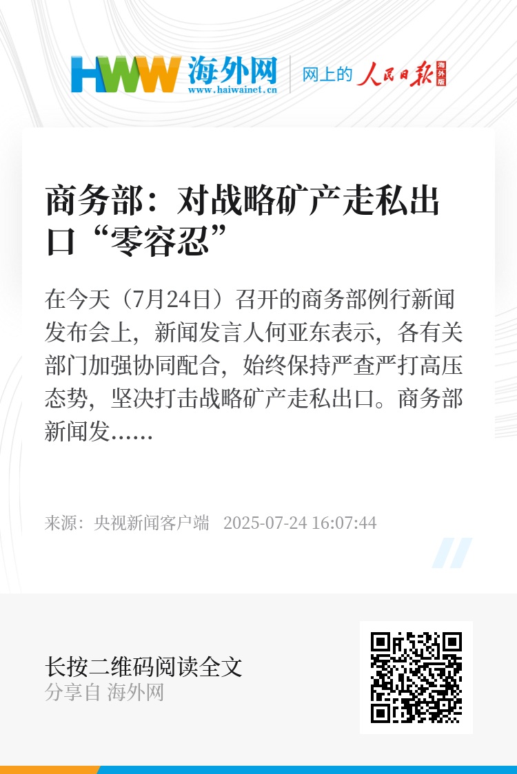 在今天(7月24日)召开的商务部例行新闻发布会上,新闻发言人何亚东表示,各有关部门加强协同配合,始终保持严查严打高压态势,坚决打击战略矿产走私出口。