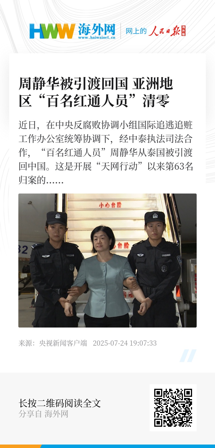 近日,在中央反腐败协调小组国际追逃追赃工作办公室统筹协调下,经中泰执法司法合作,“百名红通人员”周静华从泰国被引渡回中国。这是开展“天网行动”以来第63名归案的“百名红通人员”。