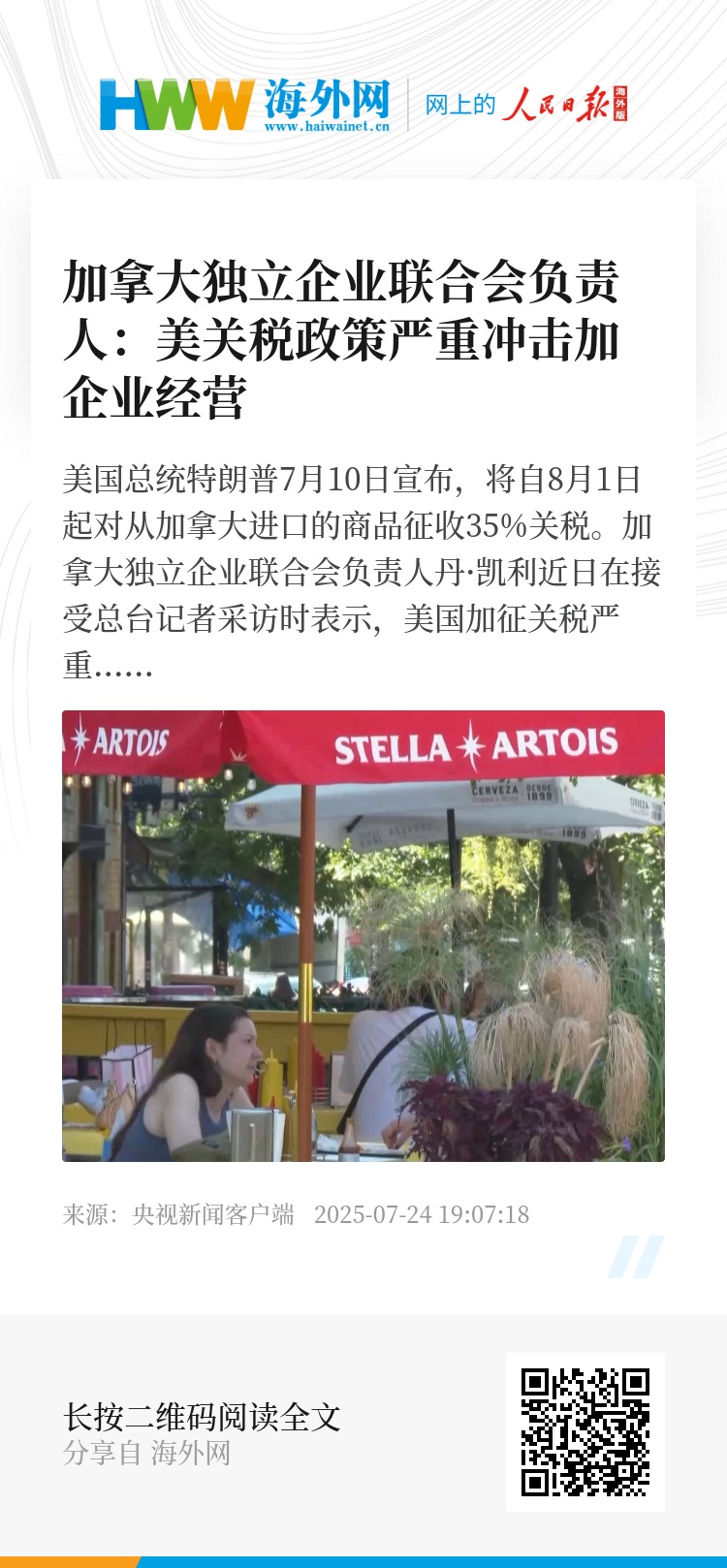 美国总统特朗普7月10日宣布,将自8月1日起对从加拿大进口的商品征收35%关税。加拿大独立企业联合会负责人丹·凯利近日在接受总台记者采访时表示,美国加征关税严重冲击加拿大企业经营活动,加拿大企业界正在失去对美国的信任。