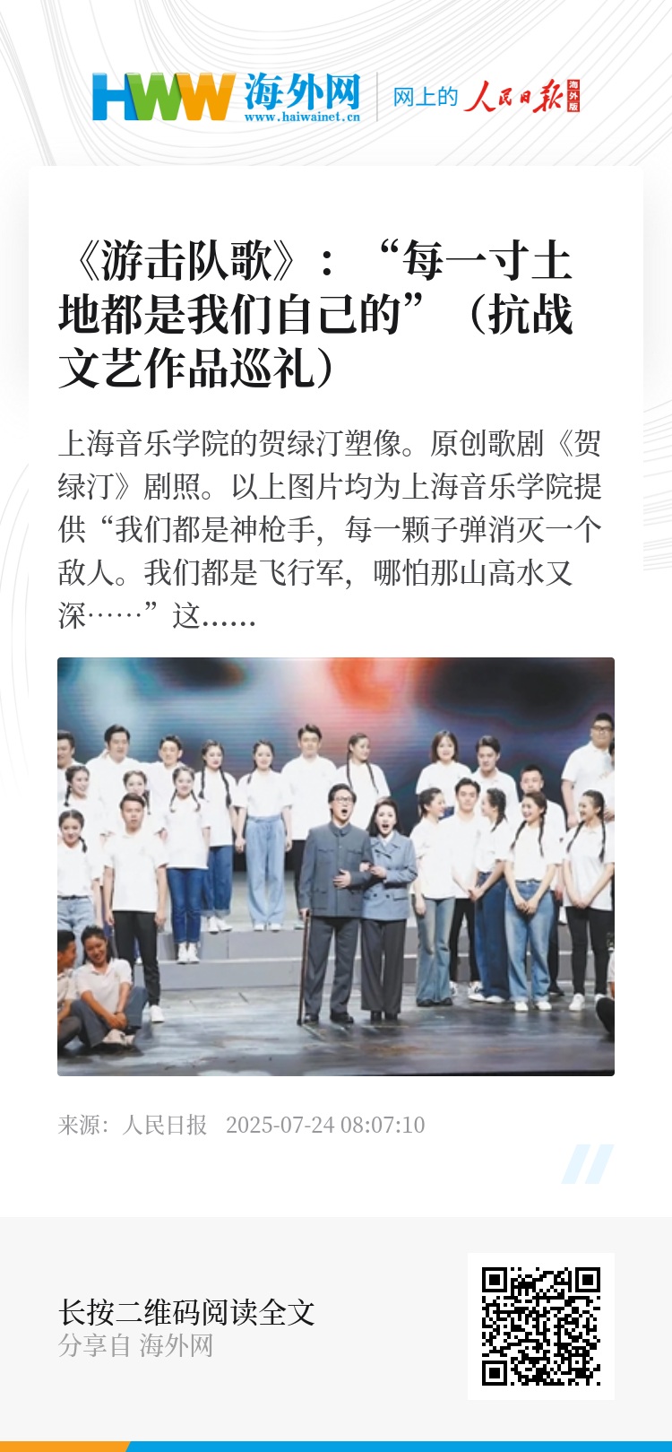“我们都是神枪手,每一颗子弹消灭一个敌人。我们都是飞行军,哪怕那山高水又深……”这首脍炙人口的《游击队歌》是抗战经典歌曲,是一首我每每唱起总会心潮澎湃的作品。它由人民音乐家、中国专业音乐奠基人之一,也是新中国成立后上海音乐学院首任院长贺绿汀创作。在纪念中国人民抗日战争暨世界反法西斯战争胜利80周年之际,我们一起重温这首抗战经典作品,了解歌曲背后的故事,感受拳拳爱国之心、殷殷报国之志。