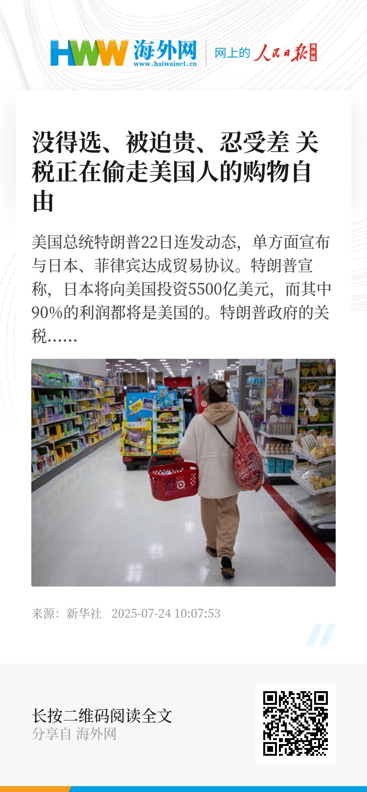 美国媒体认为,关税对美国消费者真正的伤害,不只是在于价格冲击,更大的则在于它正侵蚀美国消费者自由选择所需商品的权利。