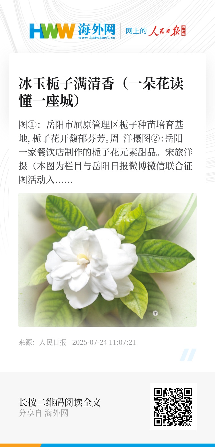 从枝头到发梢,从田间到车间,从果园到景点……雪白的栀子花,见证着岳阳与长江中游城市群的繁荣发展,也为农户、市民与游客的美好生活增添了一抹亮色。(记者 杨 迅)
