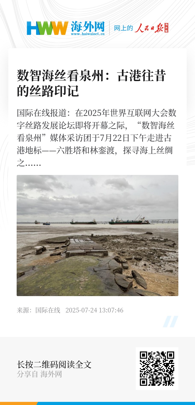 国际在线报道:在2025年世界互联网大会数字丝路发展论坛即将开幕之际,“数智海丝看泉州”媒体采访团于7月22日下午走进古港地标——六胜塔和林銮渡,探寻海上丝绸之路起点的历史基因与文化传承,感受千年商脉中流淌不息的丝路精神。