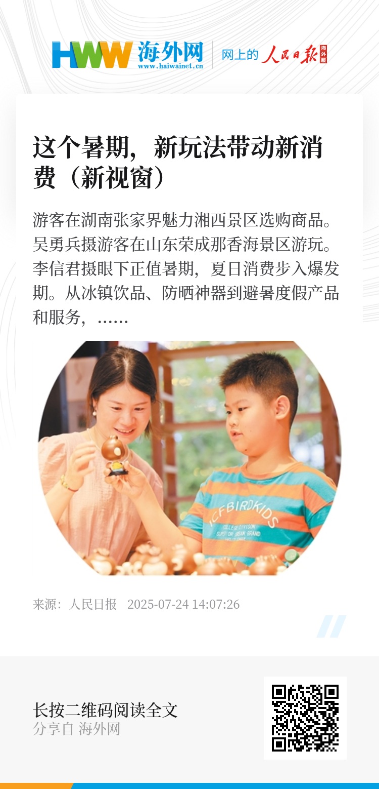 眼下正值暑期,夏日消费步入爆发期。从冰镇饮品、防晒神器到避暑度假产品和服务,多样化需求带动各类暑期消费“热力”全开。夏日经济动能澎湃,映衬出国内大市场的蓬勃生机与活力。