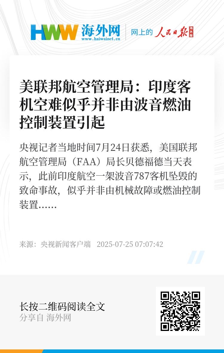 央视记者当地时间7月24日获悉,美国联邦航空管理局(FAA)局长贝德福德当天表示,此前印度航空一架波音787客机坠毁的致命事故,似乎并非由机械故障或燃油控制装置意外移动造成。