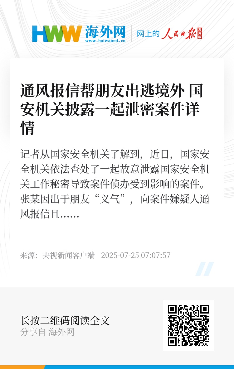 记者从国家安全机关了解到,近日,国家安全机关依法查处了一起故意泄露国家安全机关工作秘密导致案件侦办受到影响的案件。张某因出于朋友“义气”,向案件嫌疑人通风报信且拒不配合国家安全机关执法工作,依法受到处罚。