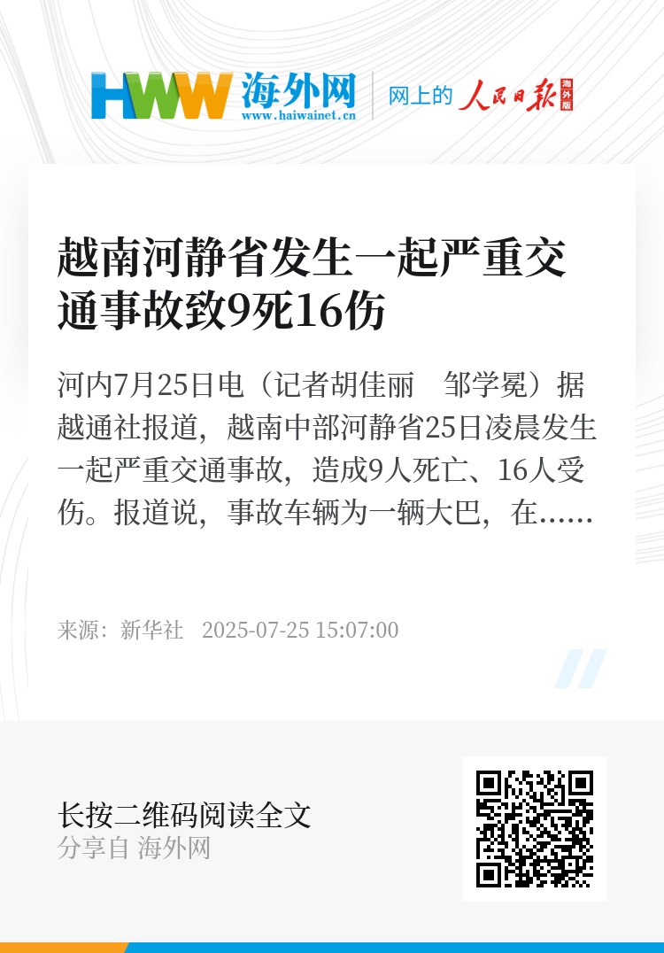新华社河内7月25日电(记者胡佳丽 邹学冕)据越通社报道,越南中部河静省25日凌晨发生一起严重交通事故,造成9人死亡、16人受伤。