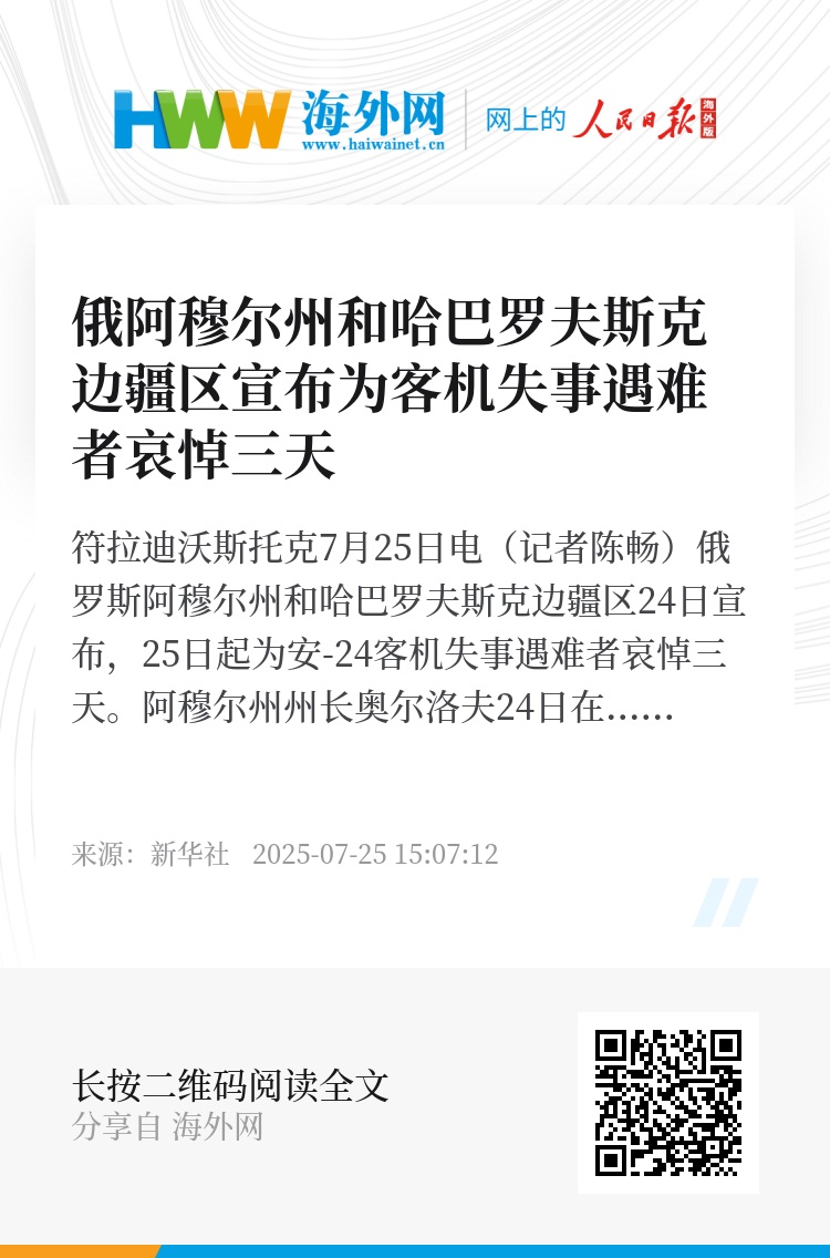 新华社符拉迪沃斯托克7月25日电(记者陈畅)俄罗斯阿穆尔州和哈巴罗夫斯克边疆区24日宣布,25日起为安-24客机失事遇难者哀悼三天。