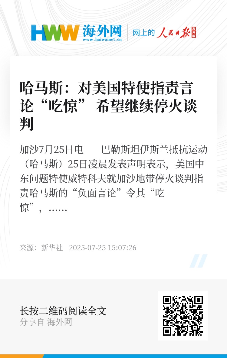 新华社加沙7月25日电 巴勒斯坦伊斯兰抵抗运动(哈马斯)25日凌晨发表声明表示,美国中东问题特使威特科夫就加沙地带停火谈判指责哈马斯的“负面言论”令其“吃惊”,哈马斯渴望与以色列达成停火协议,以结束以军的侵略和加沙人民的苦难。